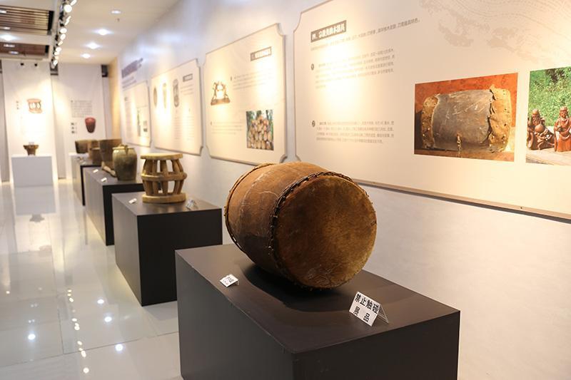 “器具图鉴”展区按生产、生活、娱乐、宗教四大类划分,近30种器具覆盖先民日常与精神生活,点穴棒、独木米桶、顶棍等各具功用,尤以刻有人纹、狩猎图案的独木皮鼓最具代表性,是黎族文化权威的象征。