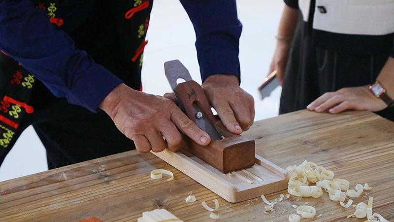“工艺解析”展区通过实物与图文,呈现“火烧碳化+人工刳制”的独特工艺,器具多素面古朴、以实用为本,少数饰以简单花纹,从天然枝杈独木凳到鼓形雕花凳,凝聚匠人巧思;